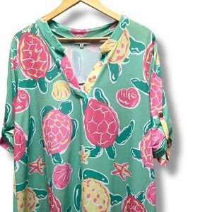 Super cute. Screams beach and summer. Light green, pale yellow, and pink sea turtle print. Split hemline. V-neck. 3/4 adjustable button sleeves.