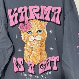 Simply Southern Karma Is A Cat Graphic Long Sleeve T-Shirt Women's L Dusty Blue