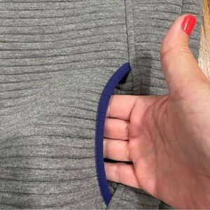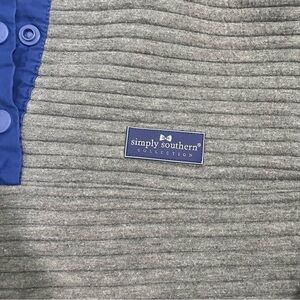 This is a ladies Simply Southern gray pullover with front pockets. There are 4 snap buttons at the mid chest to collar. The pullover is gray and is trimmed with bright blue. It shows minor pilling and is a polyester blend. The pullover is a size medium.