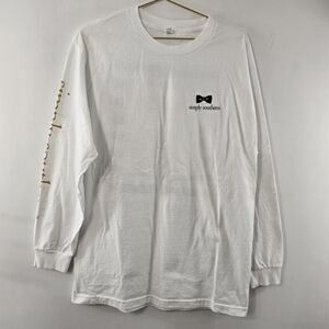 In excellent condition, this casual long sleeved monogram logo t-shirt t shirt tshirt is the perfect comfortable top for any relaxed occasion. Straight cut. Front small logo with bow tie bowtie detail at chest, metallic elongated big hit fire logo on sleeve and and South, adjective, a state of mind: on the back with a metallic gold golden pineapple, factory-distressed stripe block border and Simply Southern logo at bottom. Vacation tropical beach cruise chill vibes. 40" chest and 29.5" long: measurements are approximate.