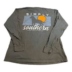 Introducing a stylish Simply Southern long sleeve shirt sized medium. This shirt boasts a solid/print pattern and a classic/fitted sleeve style with a crew neck neckline. Made from cotton material, this shirt also features a logo accent and is easy to care for. Perfect for both men and women, this preppy themed shirt is available in a gray color and is suitable for any occasion. Whether dressing up or down, this regular fit shirt is a wardrobe essential.