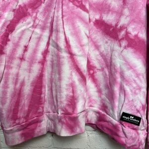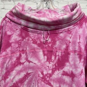 Pink and white tie dye lightweight sweatshirt. Cowl neck with drawstrings. Simply Southern logo at bottom left corner.