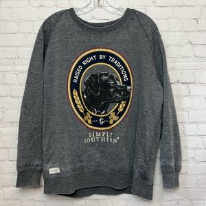 This gray long sleeve sweatshirt has a front graphic design with an oval ring containing the words "Raised Right by Tradition", a black dog in the middle and the Simply Southern Logo underneath. A small Simply Southern logo on the back.