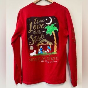 Red cotton tee with logo on chest and sleeve. Chriatmas manger scene on back with “true love was born in a stable” and “The King is born” in script. Comfortable and stylish.