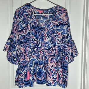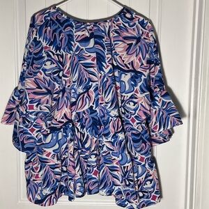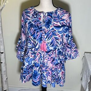 Vibrant ruffle blouse featuring blue, pink, and white. Tassel ties. Measures 22” from armpit to armpit, 24” from shoulder to hem and 13” sleeves.