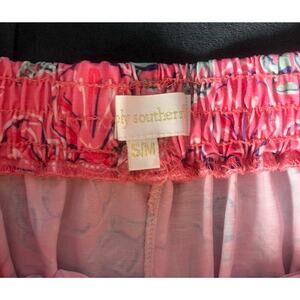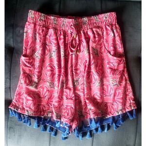 Simply Southern pull on elastic waist shorts. Pink with a seashell pattern and blue tassels. Tie front, front pockets, polyester/spandex blend, lightweight and perfect for the beach or vacation. Very good condition, smoke free home.