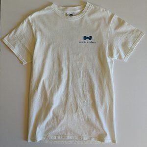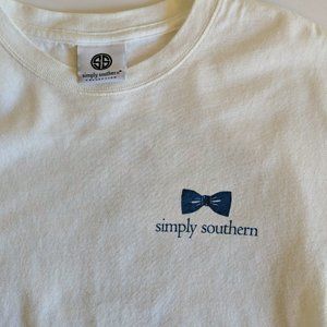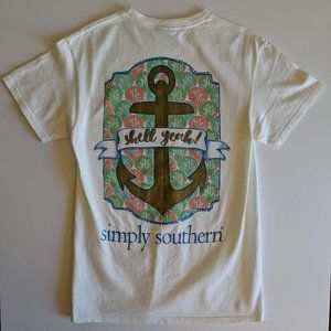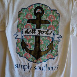 The shirt has the text "Simply Southern" and a bow on the left chest and on the back an image of gold anchor with turquoise and pink shells with the text "Shell Yeah!" And "Simply Southern."