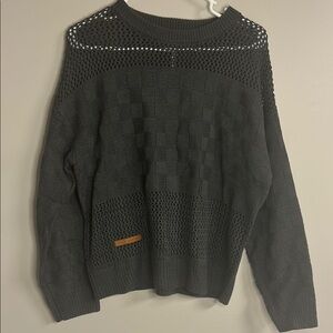 This black crewneck sweater features a textured knit pattern that adds depth and style. The relaxed fit and long sleeves make it a comfortable choice for any occasion. A small tag detail on the lower left side adds a subtle touch of character. 22” PTP