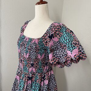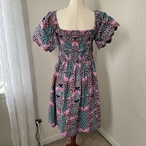 Simply Southern Smocked Dress Womens Large Pink Flamingos Floral Puff Sleeve