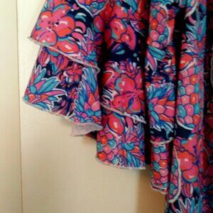 It features ruffled short sleeves and an elasticized neckline. The shirt's pattern includes pink flowers and blue pineapples on a dark blue background.