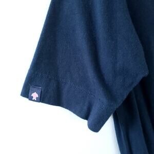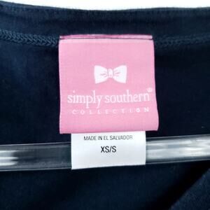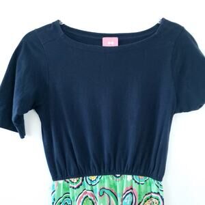 Short-sleeved knit dress with a navy blue top and paisley print bottom. It has an elastic waist and features the “Simply Southern” turtle tag on the left sleeve.