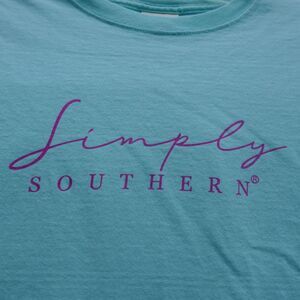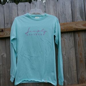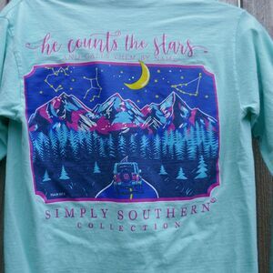 Simply Southern long sleeve women's crew neck t-shirt. Front of shirt has Simply Southern spell-out in pinkish-purple, turtle logo cloth tag. Pinkish-purple spell-out down left sleeve. Back of shirt has mountain highway scene under the stars in shades of pink/purple, blue, white, yellow. Above picture reads "He counts the stars and calls them by name" from Psalm 147-4. Under picture reads Simply Southern Collection. Pre-owned, no flaws noted Size - small Approximate measurements taken with shirt flat and unstretched: Chest - across underarms in front = 17 inches Length - from shoulder down front = 26 inches Cat-friendly, non-smoking home SKU# 1156