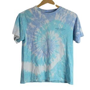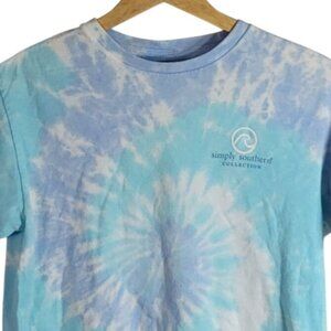 Simply Southern Blue Tie Dye T Shirt Short Sleeve Crew Neck Image On Back Waves Sun Rainbow 100% Cotton Shows Some Wash Wear