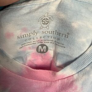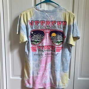 Vibrant tie-dye t-shirt by Simply Southern. Features a mix of pastel colors. Comfortable and stylish for casual wear.