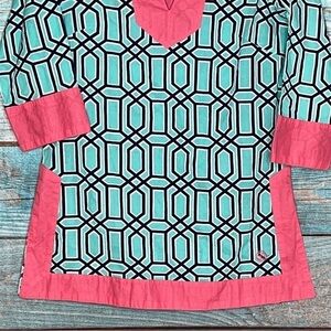SS tunic top. Size small. Pink & blue. Geo print with thick trim. Split sides. Embroidered logo. 3/4 sleeves. Preloved.