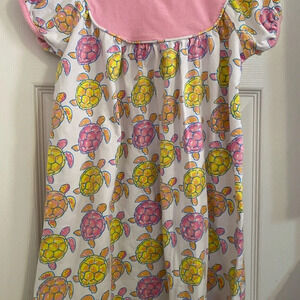 Simply Southern Turtles Dress Size 4T White shirt sleeve knit dress with pink trim around sleeves and neckline Turtle print Smoke free home