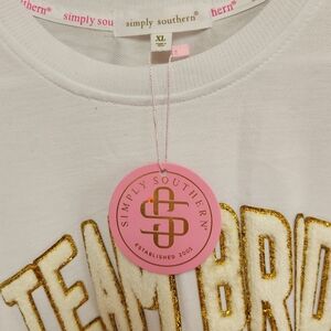 This Simply Southern hoodie showcases a chic white and gold color scheme, highlighted by a unique curved text design on the front. Perfect for casual outings, this top combines style and comfort effortlessly. Its soft fabric ensures a cozy fit, making it a must-have addition to your wardrobe.