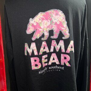 This Simply Southern Mama Bear Black Cowl Neck Sweatshirt is the perfect blend of comfort and style for casual wear. Designed with a relaxed fit, this sweatshirt features a unique floral bear print with the text 'MAMA BEAR' beautifully integrated into the design. Made from a soft, high-quality fabric, it ensures warmth while maintaining breathability. Color: Black with a decorative floral bear pattern in pink and white. Material: This cozy sweatshirt is crafted from a premium cotton blend that offers both comfort and durability. Size: Women's Large, ensuring a comfortable fit with stylish cowl neck detail. Brand: Simply Southern, known for their distinctive and charming designs. Ideal for moms who love combining functionality with a touch of fun in their wardrobe, this sweatshirt is perfect for everyday wear or casual outings. Whether you're running errands or simply lounging at home, embrace your 'Mama Bear' spirit in style.