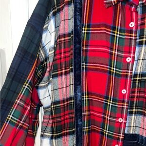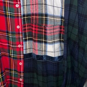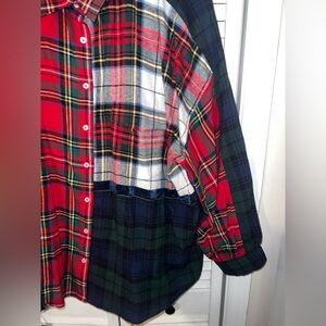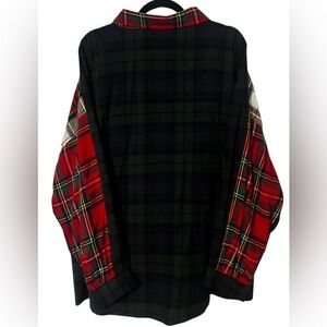 Make a bold statement with this unique patchwork plaid shirt! Featuring a vibrant mix of classic patterns in red, green and navy.