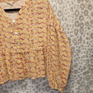 Simply Southern XL Cropped Sunflower Blouse with cute button detail and raw edge ruffles and puffy sleeves
