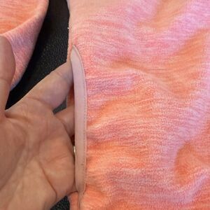 Cozy pullover with a lavender top and coral body. Features a quarter-zip design.
