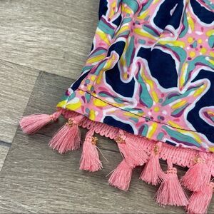 Navy blue, Pink starfish print, Pink tassel hem line, Elastic waist, Faux drawstring, Slash hip pockets, Stretch nylon fabric