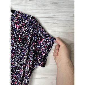 Color/Pattern: Black base with multicolor abstract confetti print (pink, purple, white)