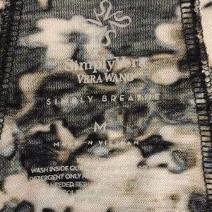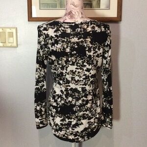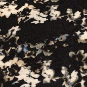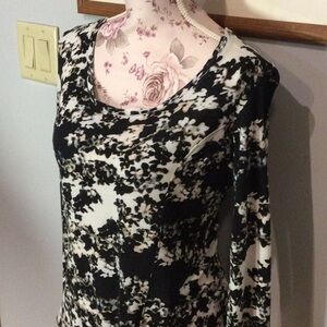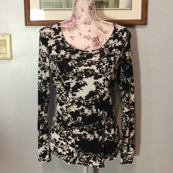 Made of 100% rayon. Features floral design, scoop neckline, and long sleeves. Drops slightly in back. Soft and comfy, and in very good condition, i.e., no rips, stains, or other damage!