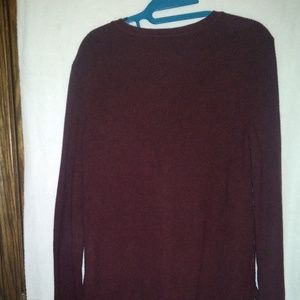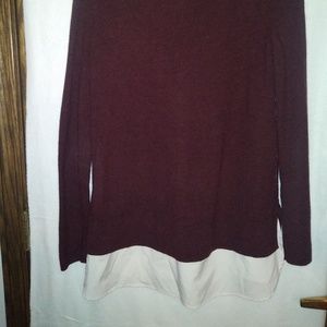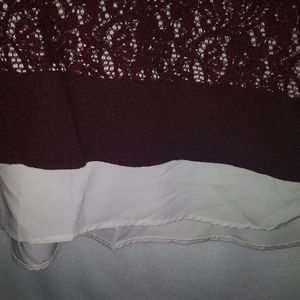 Beautiful Burgundy sweater with lace in the front and an attached cream colored lining underneath that extends beyond the lace all the way around at bottom.
