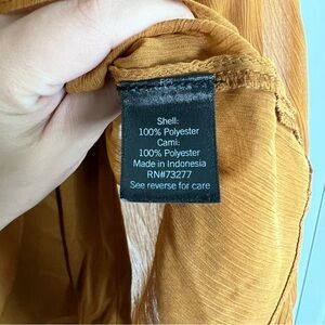 This blouse has a sheer long sleeve and a separate solid cami that are not attached. The top shirt has balloon sleeves with elastic wrist. There is a neck tie.