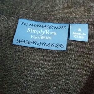 A beautiful classy, basic, light-weight charcoal gray sweater by designer Vera Wang with added bottom details. The sweater hem is beaded with oblong black sequins atop 2 rows of black chiffon. Full length sleeves. Tiny black hook and eyes for front closure. Pretty feminine fit. Fabric content tags have been cut out, but it feels like a soft, small gauge polyester yarn. Hand wash.