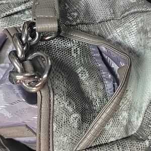 This is a very lovely simply vera bag. It's a creamy mint's color with gray and gray piping. Excellent condition. With a metallic chain adding onto the handle.