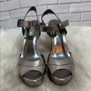 Heel height is 5", with 1.5" platform. In very good pre-owned condition. Normal wear and tear noted, but no flaws or damage. Please review pictures and feel free to ask any questions or for more pictures prior to purchasing.