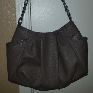 Taupe/mushroom color with gunmetal chain accents. 2 large pockets on the outside corners, 1 zip pocket inside and 2 slip pockets inside. Magnetic closure to keep things secure. Approx 15 wide and 10 high.