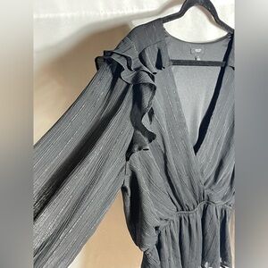 Elegant black blouse by Simply Vera Vera Wang, size Large. Features sheer lightweight fabric with subtle metallic stripes, long sleeves with ruffle accents, and a flattering wrap-style front with a peplum hem. Perfect for pairing with skirts, trousers, or jeans for a polished look.