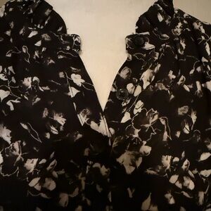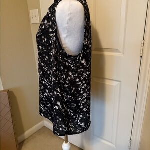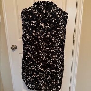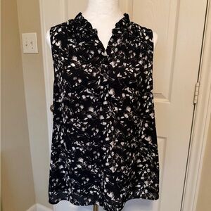 Chic floral blouse with a sleeveless design. Features a classic black and white pattern. Ideal for versatile styling.