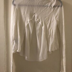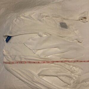 Flowy white cardigan from "Simply Vera Vera Wang." Size medium, but runs small. Features triangular panels at the waist and in the back that gives dimension and movement. Woven sections are ribbed and opaque; flowy gauze sections are slightly transparent. Wore once as a cover up to a wedding, and was lovely for that purpose! Has a feminine balletcore look.