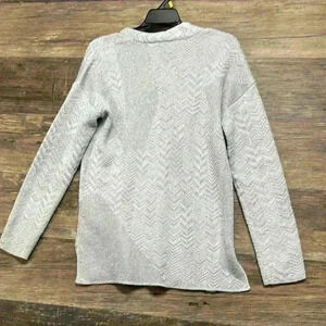 A light gray V-neck sweater with a textured knit pattern and long sleeves, perfect for a relaxed fit.