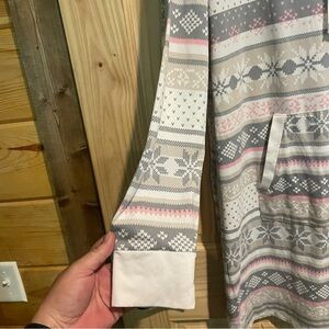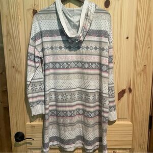 Cozy hooded pajama dress. Features a stylish pattern with drawstring hood. Perfect for lounging.