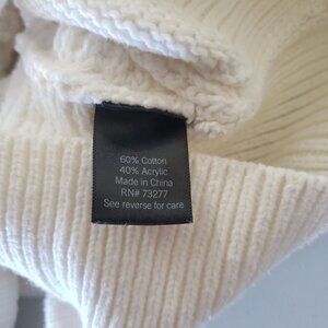 This ivory sweater offers a relaxed silhouette with intricate cable knit detailing. Its cotton and acrylic blend ensures comfort and durability with a soft texture.