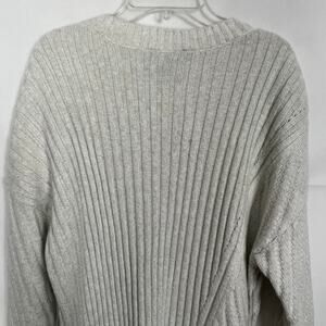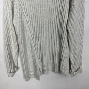 Women's pullover metallic ribbed sweater in gray. Crew neck. Dropped shoulders. Long sleeves. Folded cuffs. Intentional asymmetrical hem. In good used condition. No stains, tears or holes.