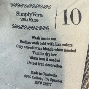 Classic mid-rise straight leg jeans by Simply Vera Vera Wang. Medium wash blue denim with a structured feel and light stretch (99% cotton, 1% spandex). Five-pocket styling with zip fly and button closure. Straight cut from hip through hem.