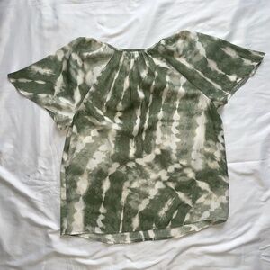 Beautiful short-sleeve blouse with a green ocean dye design, worn only once. All buttons are intact, and the fabric is lightweight and flowy. Great condition and easy to style for work or casual outfits.