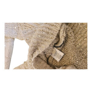 Small Beige Long Sleeve Sequin Knit Button Up Sweater is used with a bit of wear to the fabric as pictured above but otherwise is in good condition. Brand is Simply Vera, material is 53% polyester, 27% acrylic, 11% nylon, and 9% metallic.