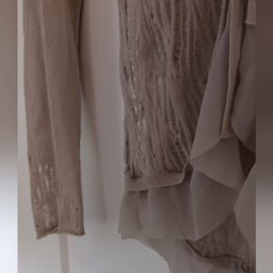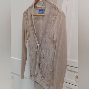 Elegant tan cardigan with intricate knit design. Open front with tie closure. Long sleeves for a chic look. Simple and sweet.