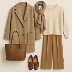 Coastal Grandma: Soft knit sweater, wide-leg trousers, loafers, oversized tote, layered scarf.