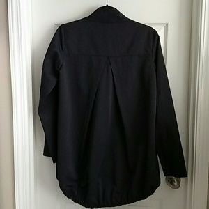 This is a Simply Vera Vera Wang coat size 4. It has dressy details like a Mandarin collar with button closures. It zips up the front and has a high-low bottom hem with a drawstring. The polyester material feels and looks like black satin.