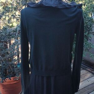 This is not a set, but they go together! The dress is a soft knit, draped neckline with a little sheer peek amid the ruffles. A gather makes a flowy accent on the skirt.  Size L measures 40 at chest, 38 at waist, 44 at hips, 39 long from shoulder to hem.  The sweater,also L, has three buttons, ruffles, front pockets, and long sleeves. It fits comfortably over the dress. Great together or separate.