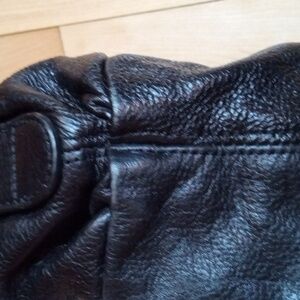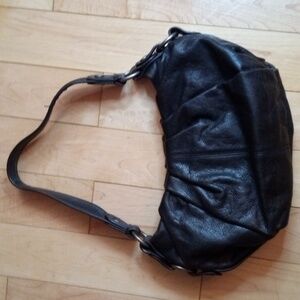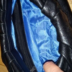Simply Vera black pebble leather handbag with ruched opening and contrasting blue interior. Featuring a magnetic closure with internal zip compartment. In great condition with minimal signs of wear at bottom on edging, see pics.