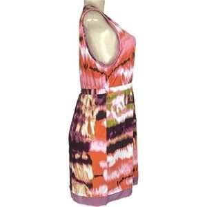 ITEM: Simply Vera Vera Wang L Purple-Coral Paint Splash Scoop Neck Mesh Trim Sleeveless Above Knee Dress